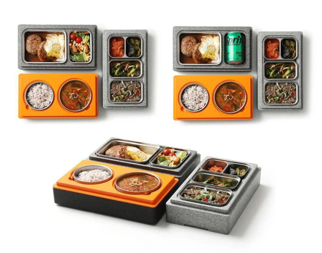 這是一款環(huán)保、可重復(fù)使用的運(yùn)輸保溫飯盒。通過強(qiáng)化米飯和湯的容器和蓋子的密封結(jié)構(gòu)來增加溫暖感,配菜模塊化,使菜單多樣化。此外,采用輕質(zhì)環(huán)保絕緣材料EPP制成的兩層或三層模塊結(jié)構(gòu)堆疊起來,可有效提高空間利用、儲存和運(yùn)輸效率。顏色為吊起消費(fèi)者胃口的橙色托盤,整體外觀搭配灰黑色調(diào)進(jìn)行協(xié)調(diào)。每個容器的蓋子和外層都有不同的顏色,以便直觀區(qū)分。