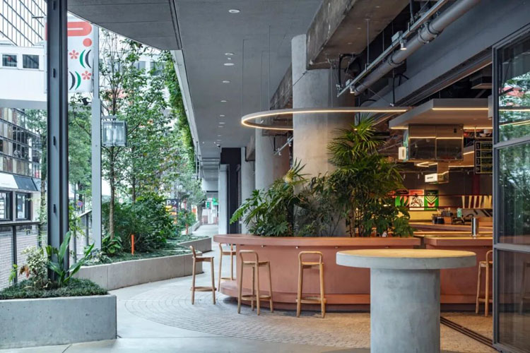 位于電車站附近的美食廣場(chǎng)改造計(jì)劃,以街道為主角營(yíng)造成廣場(chǎng)感。通過外墻退縮與可全開窗扇擴(kuò)展街道寬度,實(shí)現(xiàn)內(nèi)外連貫,并以跨越窗扇的大型吧臺(tái)拉近店鋪與行人的距離,促進(jìn)交流。